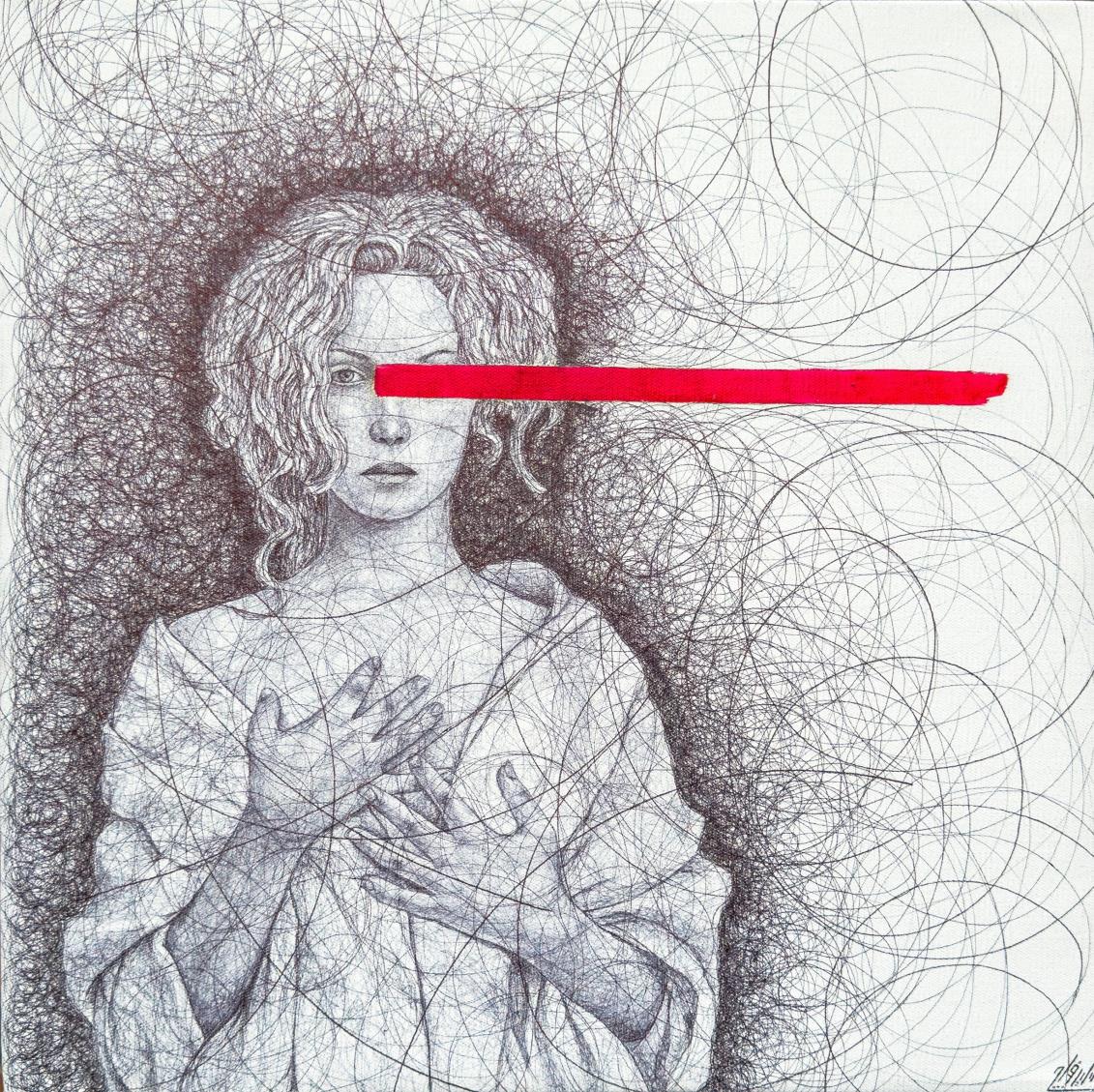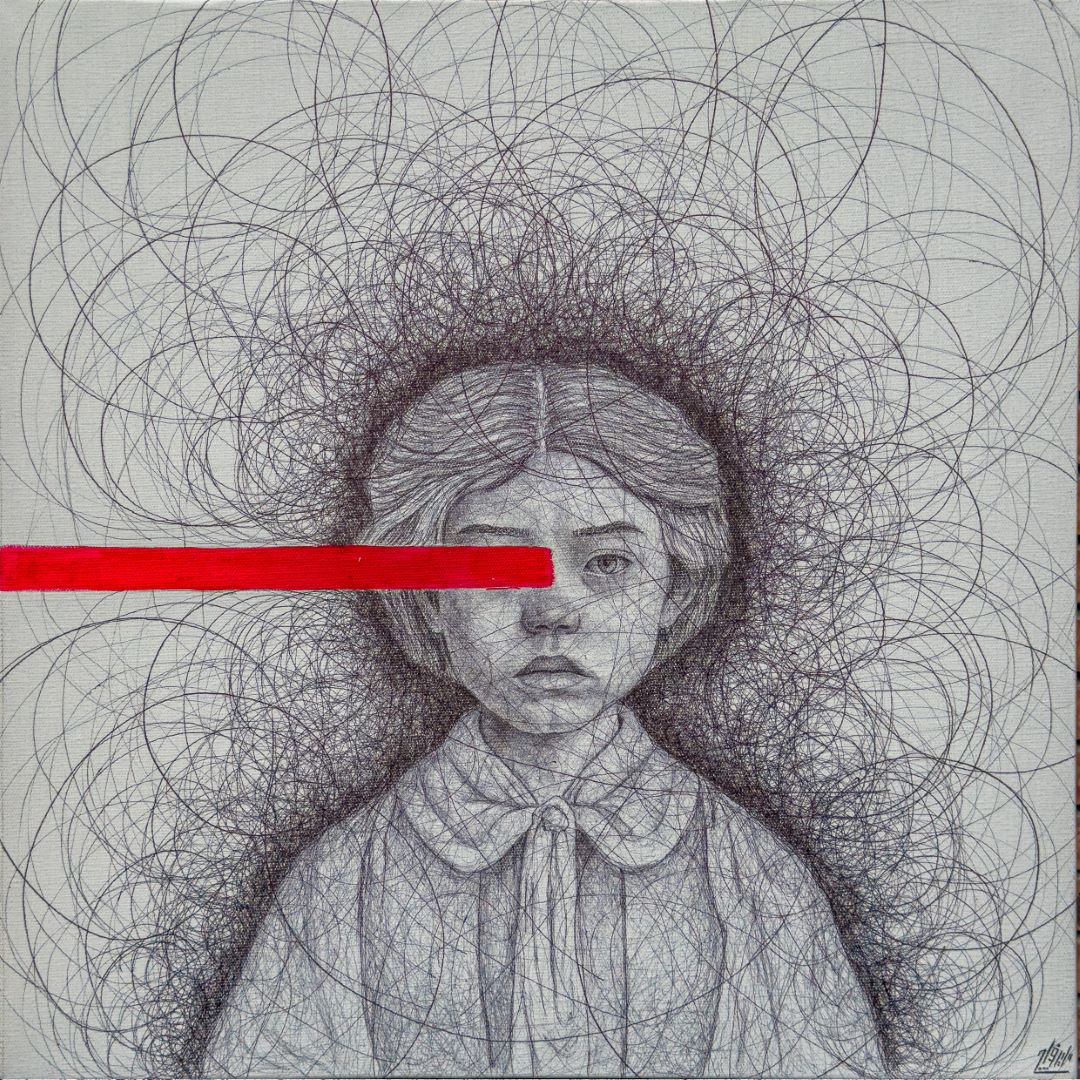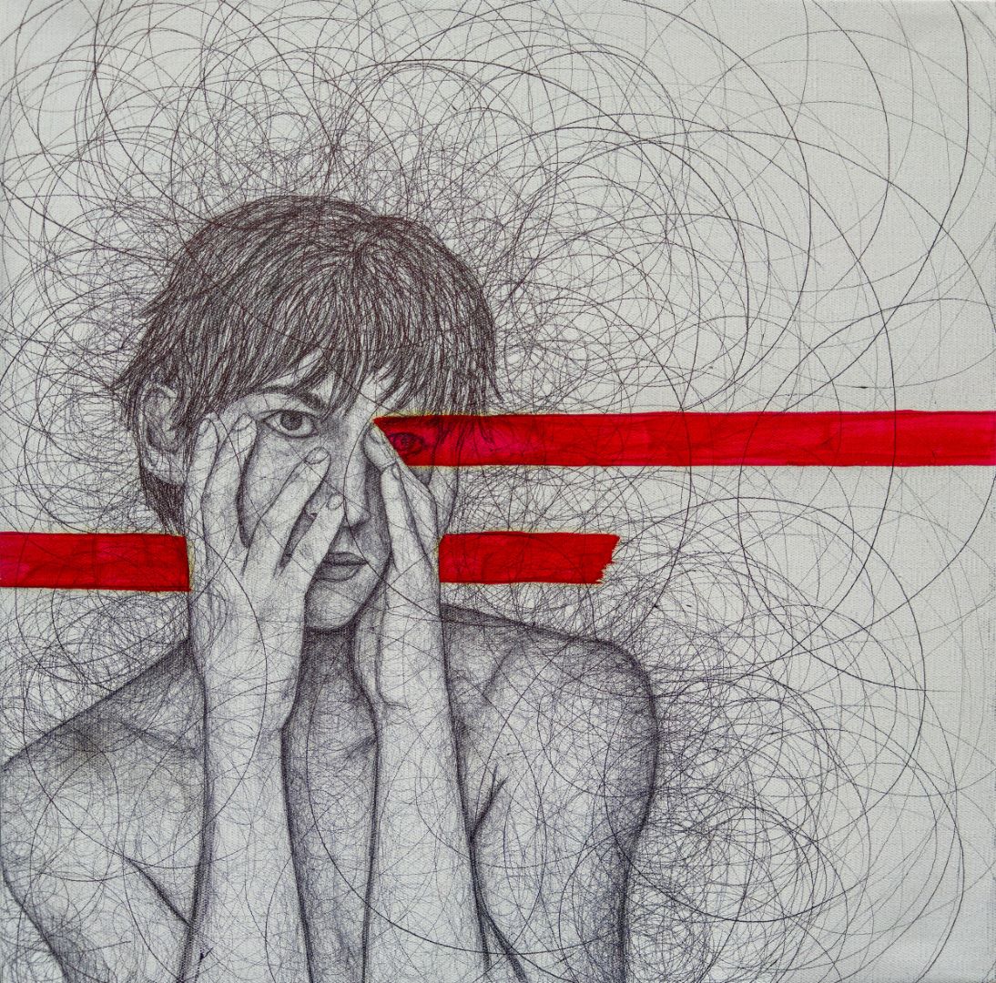 The red line is an element that both conceals and unveils a boundary between denial and affirmation, between silence and outcry. When it rests upon the eyes, it compels the gaze to take another path through the lines, through emotion, through what cannot be seen.