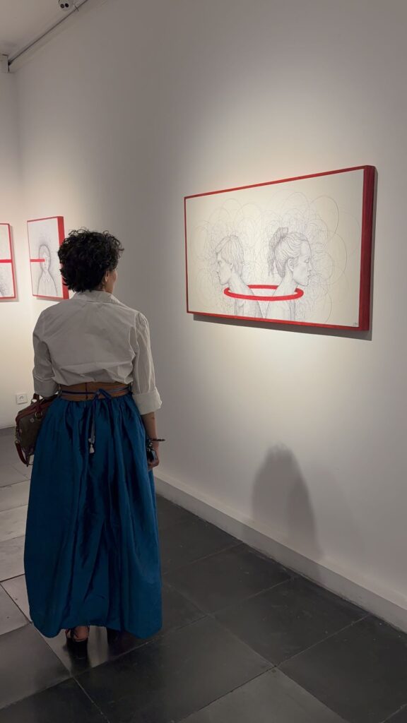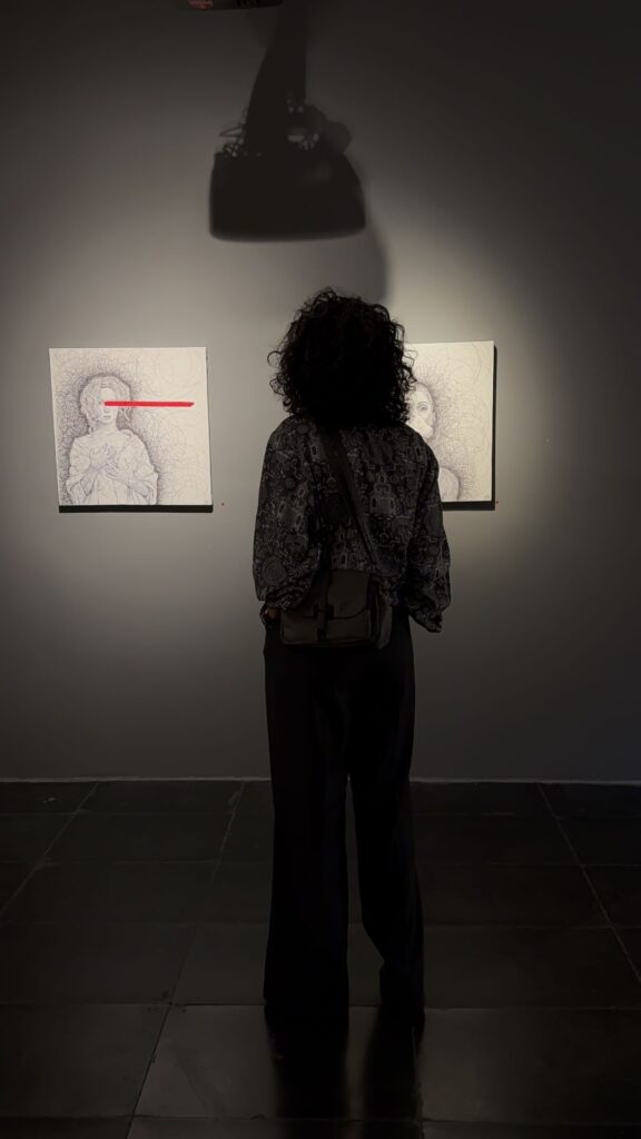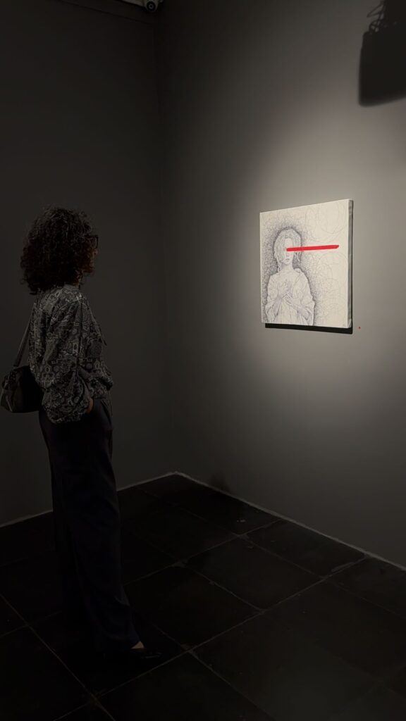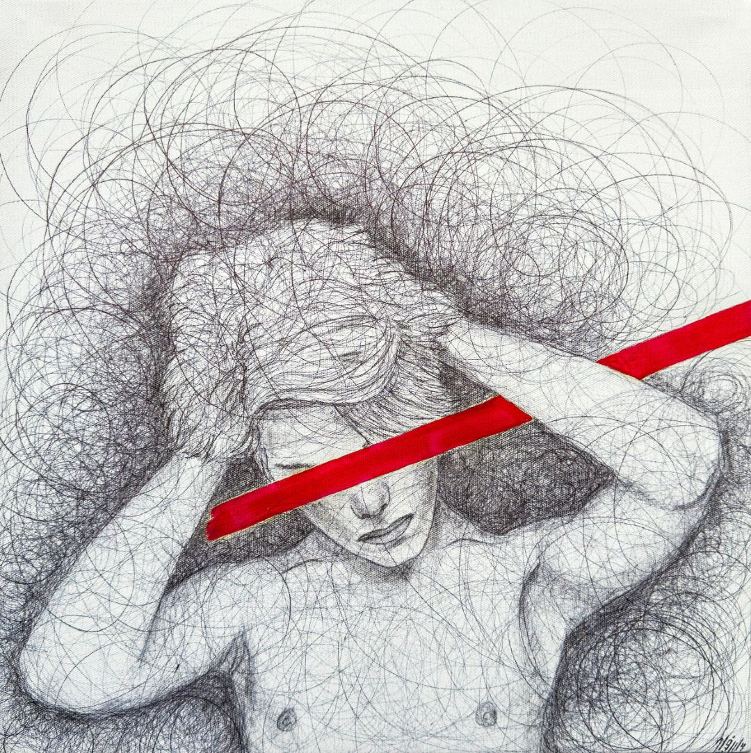 The red line is an element that both conceals and unveils a boundary between denial and affirmation, between silence and outcry. When it rests upon the eyes, it compels the gaze to take another path through the lines, through emotion, through what cannot be seen.