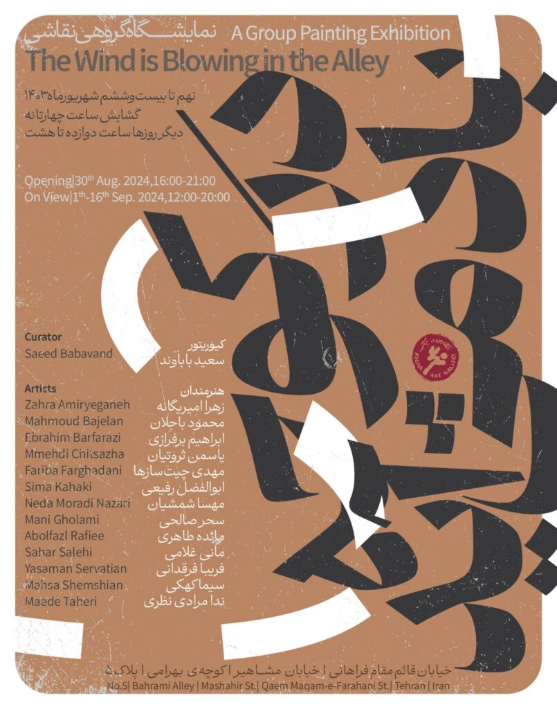 انسان مدرن در خیابان زاده شد؛ خیابانی که نه راهی میان دو مقصد بلکه خود مقصد و زیستگاه است. به بیان دقیق‌تر انسان مدرن و خیابان توامان والد و مولود یکدیگرند و هر گاه یکی را از دیگری کم کرده‌اند -تو بگو خیابان انسان‌زدایی شده یا انسان دورافتاده از خیابان- جای خالی‌اش دیده شده است. نمایشگاه «در کوچه باد می‌آید» نگاهی کوتاه به خیابان از دریچه‌ی نگاه هنرمندانی است که زیست مدرنِ انسان، دغدغه‌ی آثارشان است. آثار این نمایشگاه که بعضا از دوره‌های کاری قدیمی‌تر هنرمندان انتخاب شده گاهی با زبانی روایی و گاه با لحنی کنایی به نسبت انسان و خیابان می‌پردازد.